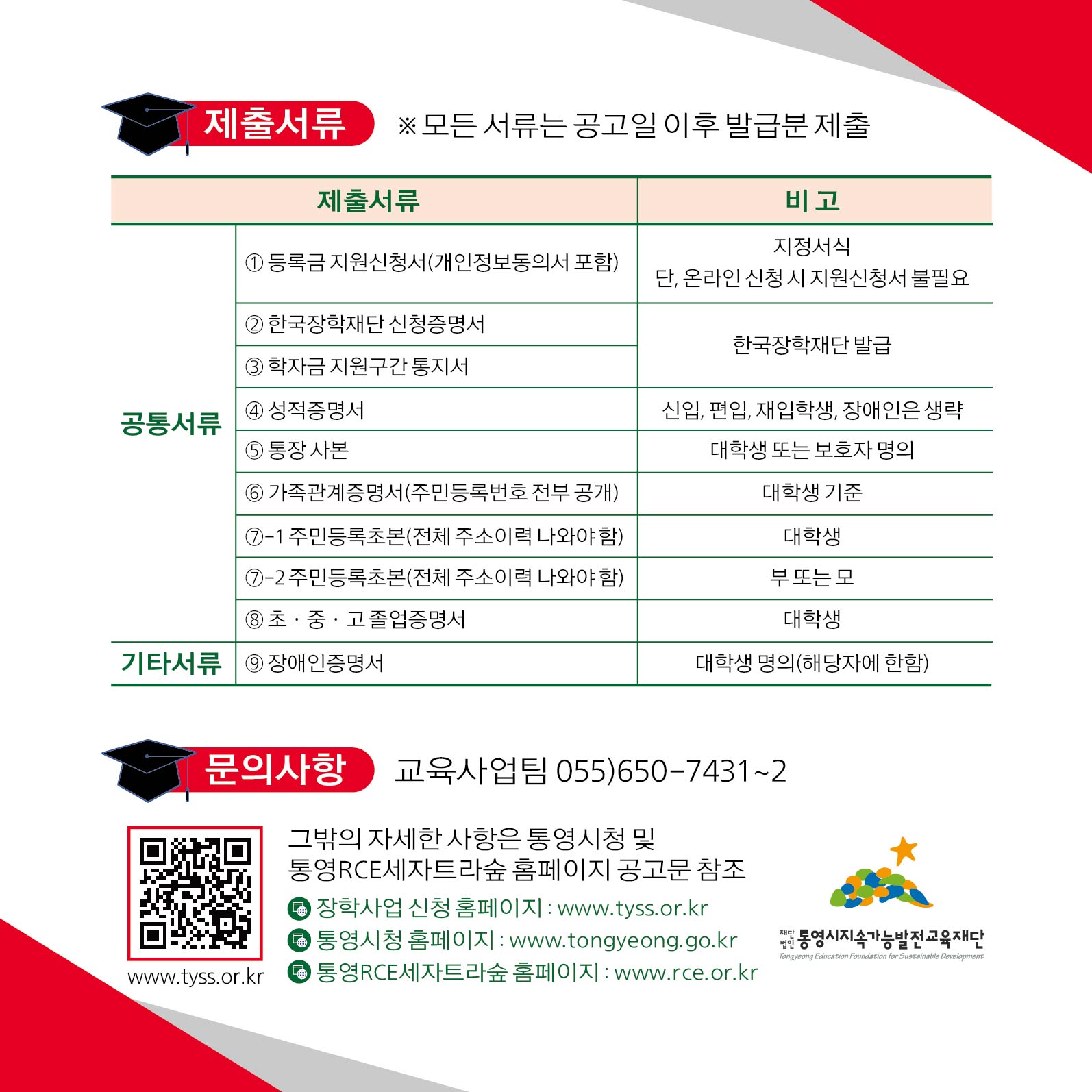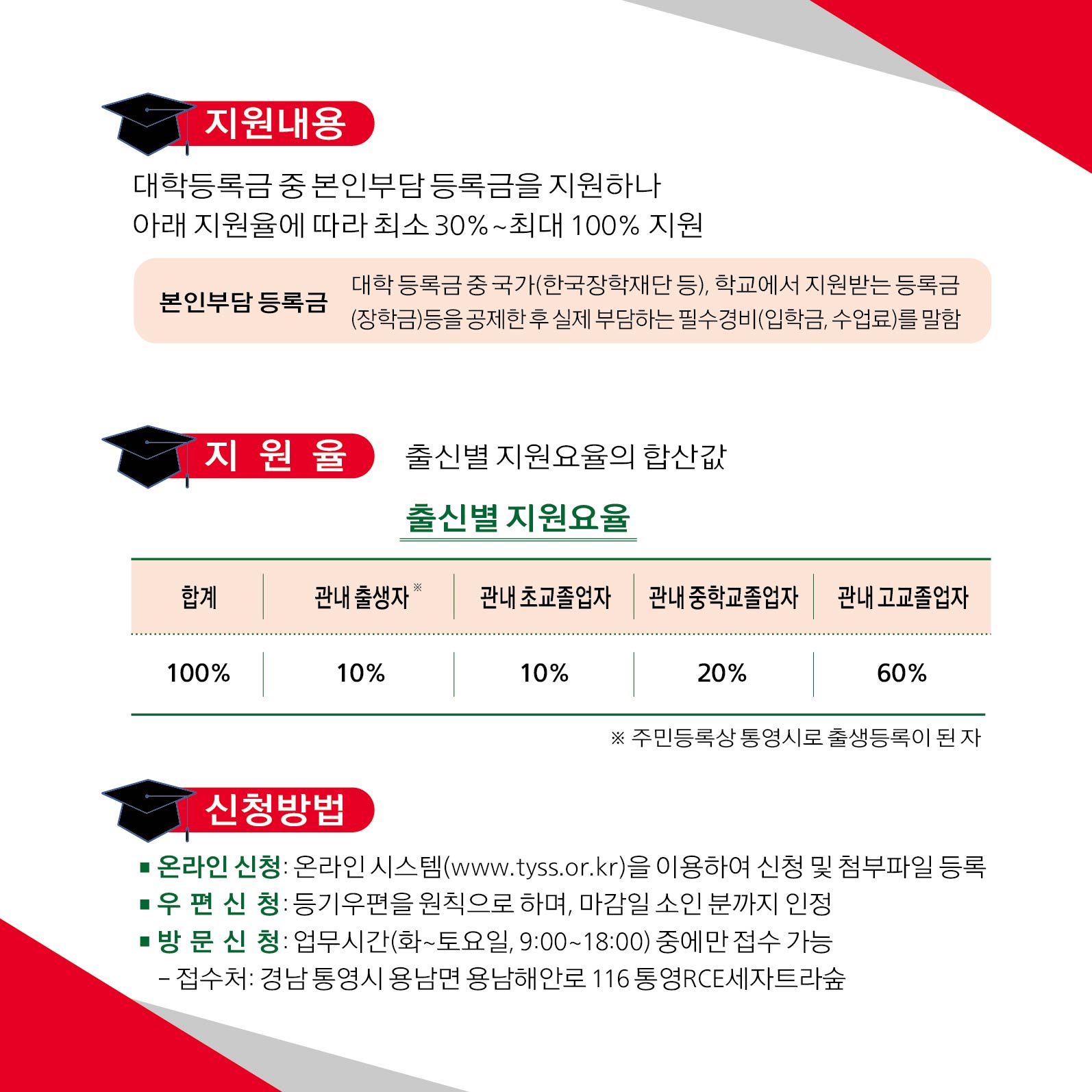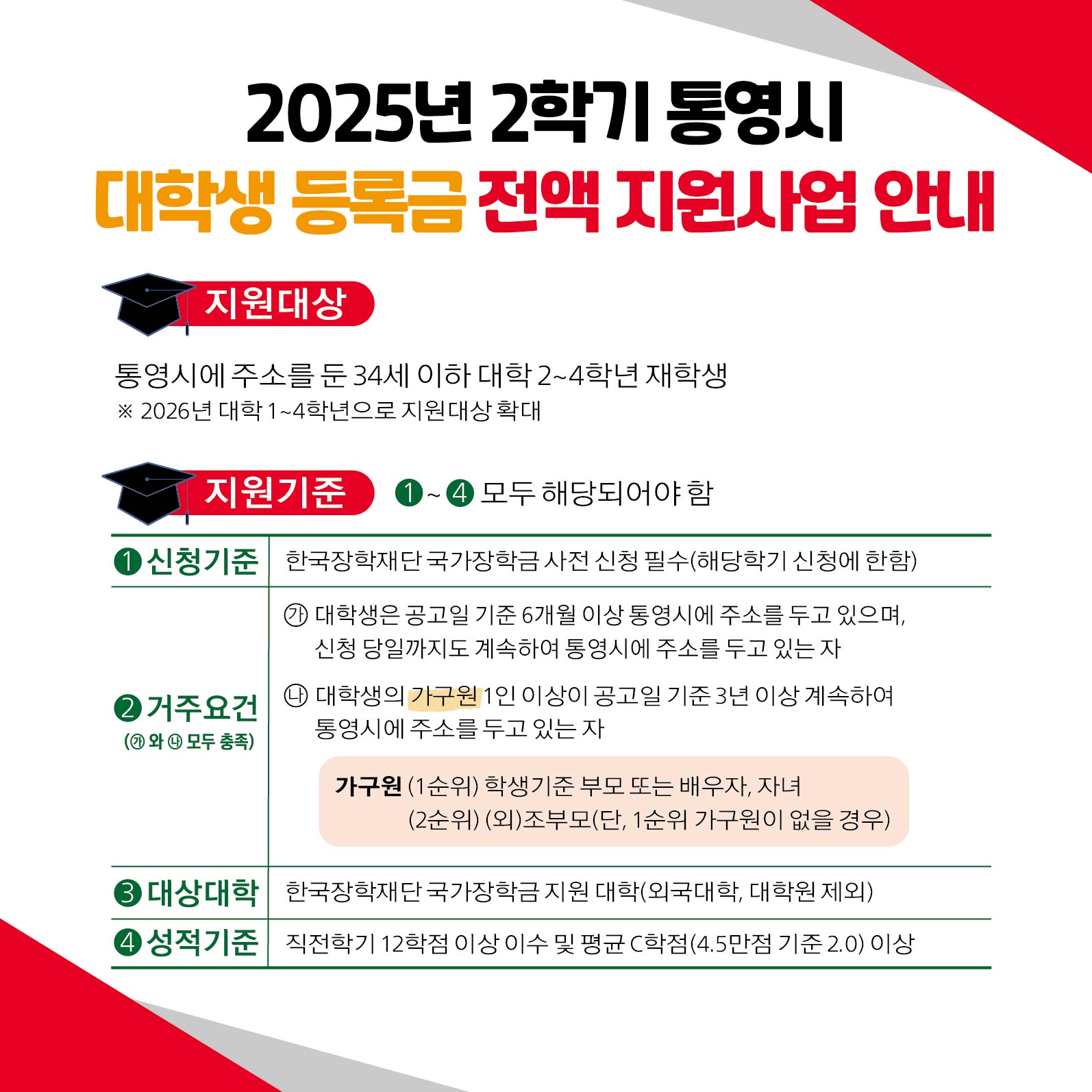 나. 지원대상: 통영시에 주소를 둔 34세 이하 대학 2~4학년 재학생